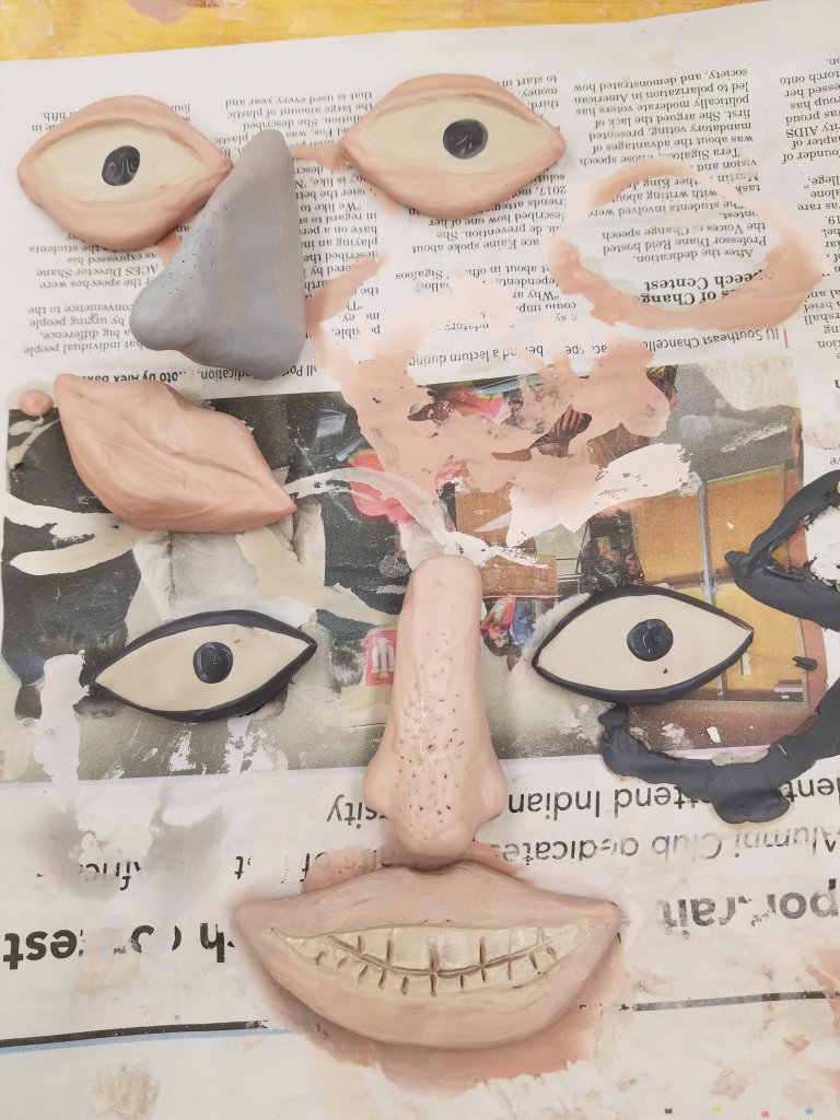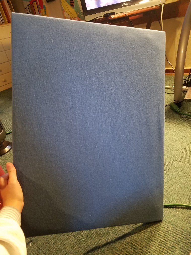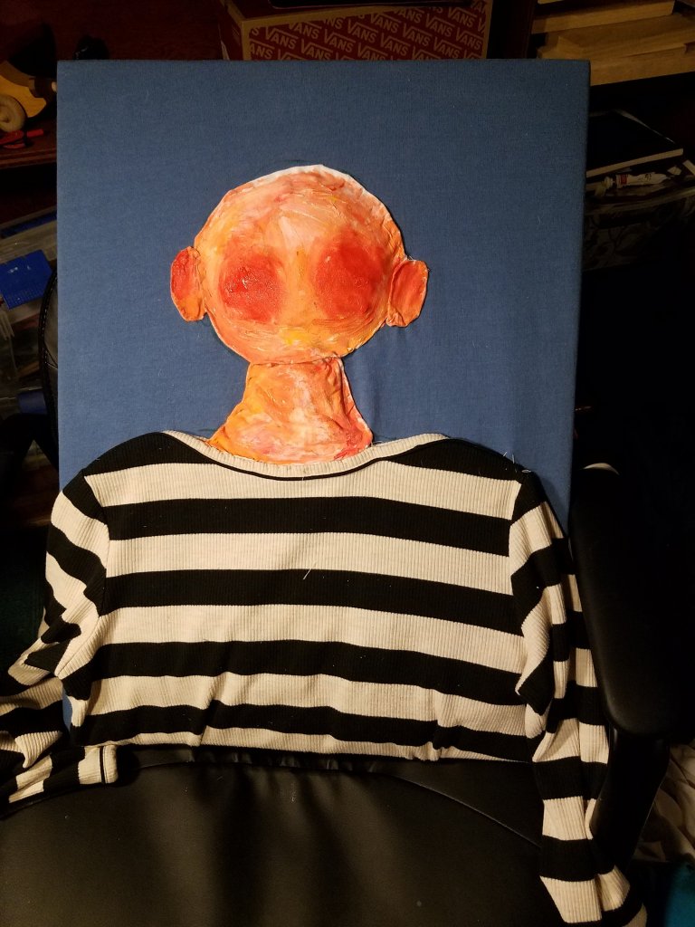 I created the piece using fabric from clothing and party supplies. Its stretched around a canvas so it could potentially be hung on a wall. The pieces were attached with sewing and glue. The size is 20″x24″