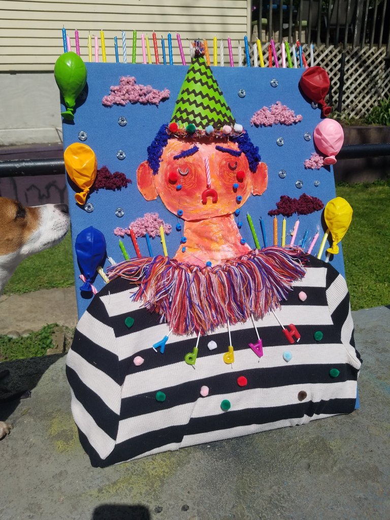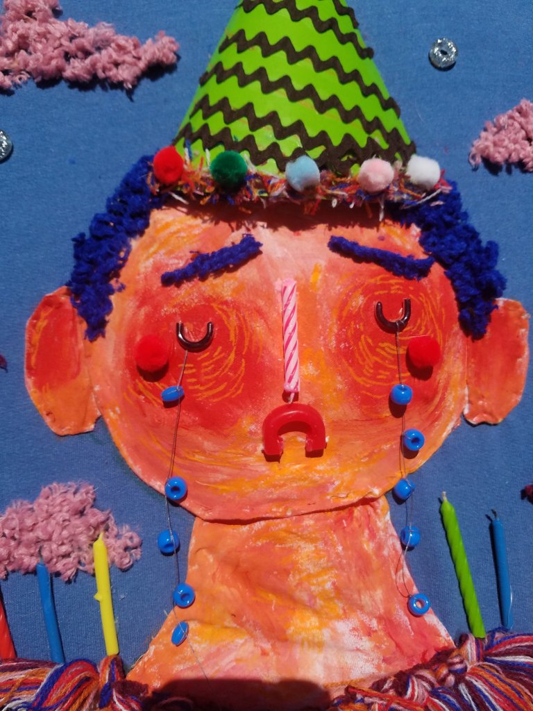I wanted to use the theme of a birthday party because I think birthday celebrations are a really interesting part of human nature considering our great fear of mortality. Birthdays are a time of togetherness and excitement, even though they are evidence of aging. It’s something that’s extra interesting to think about during quarantine, birthday parties are currently forbidden and our fears of mortality are at an all time high. I celebrated my own birthday last week, and while I did not feel sad the way the character in the piece does, I spent more time reflecting on life then I normally would have. I hope to explore these ideas more in future work and using a medium I’m more comfortable with.